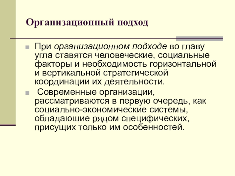 При организационном подходе во главу угла ставятся человеческие, социальные