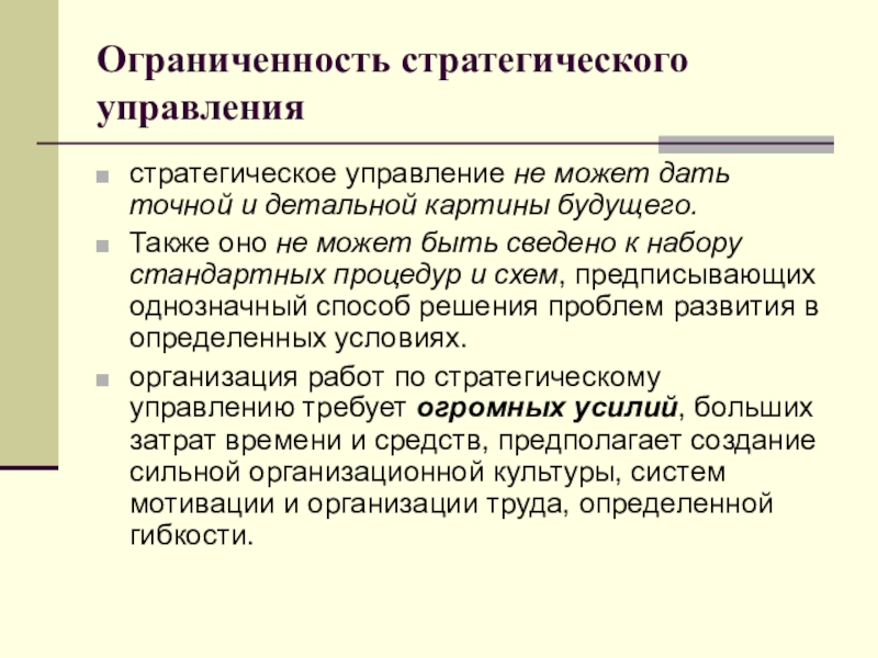 организация работ по стратегическому управлению требует огромных усилий, больших затрат времени и средств, предполагает создание сильной организационной культуры, систем мотивации и организации труда, определенной гибкости.