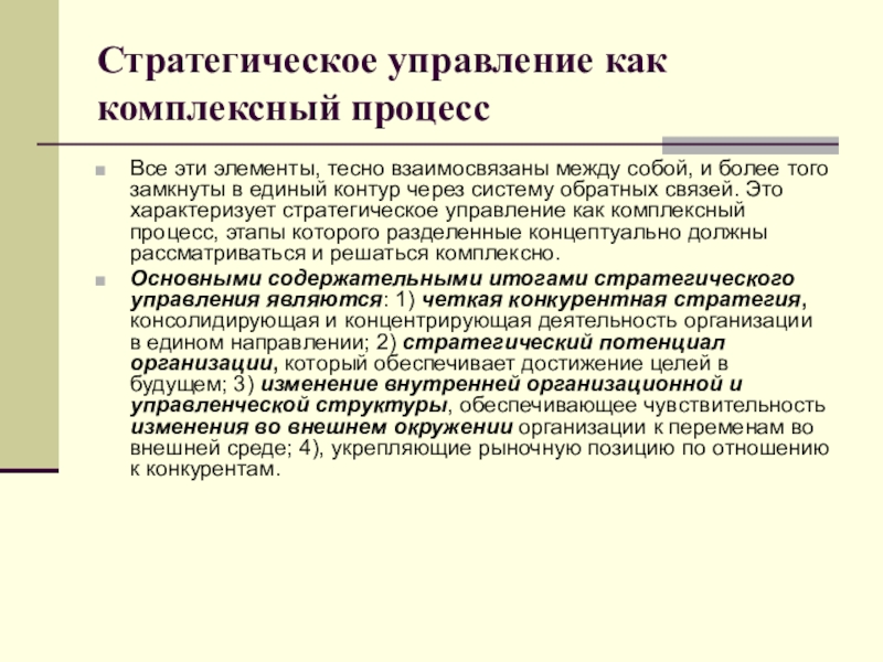обратных связей. Это характеризует стратегическое управление как комплексный процесс, этапы которого разделенные концептуально должны рассматриваться и решаться комплексно.