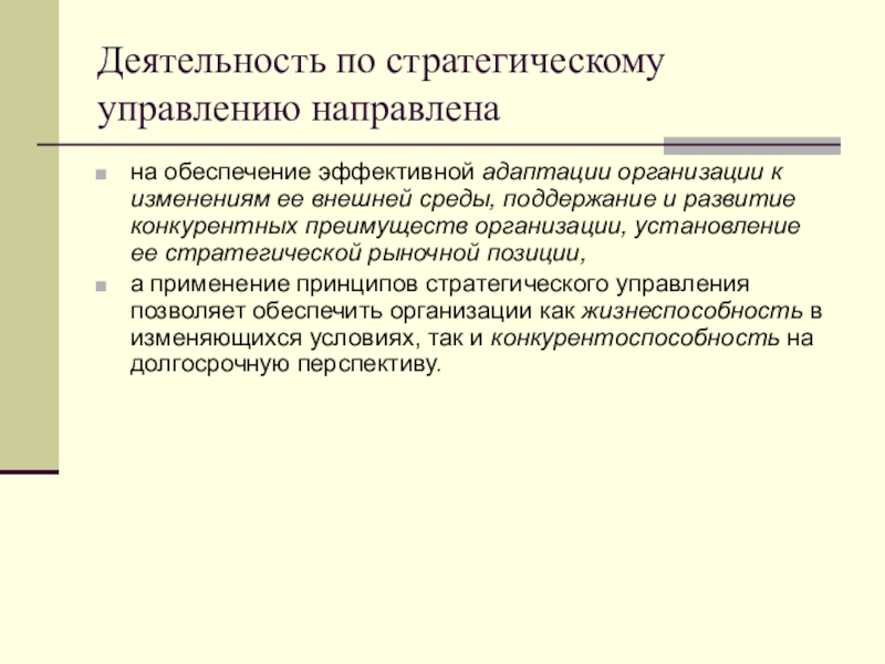а применение принципов стратегического управления позволяет обеспечить организации как жизнеспособность в изменяющихся условиях, так и конкурентоспособность на долгосрочную перспективу.