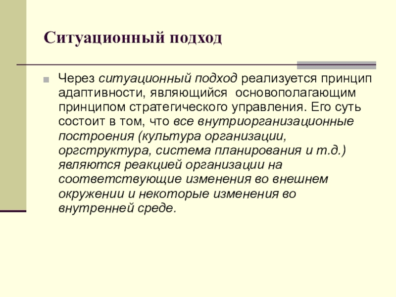 Через ситуационный подход реализуется принцип адаптивности, являющийся основополагающим принципом