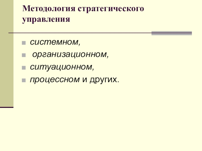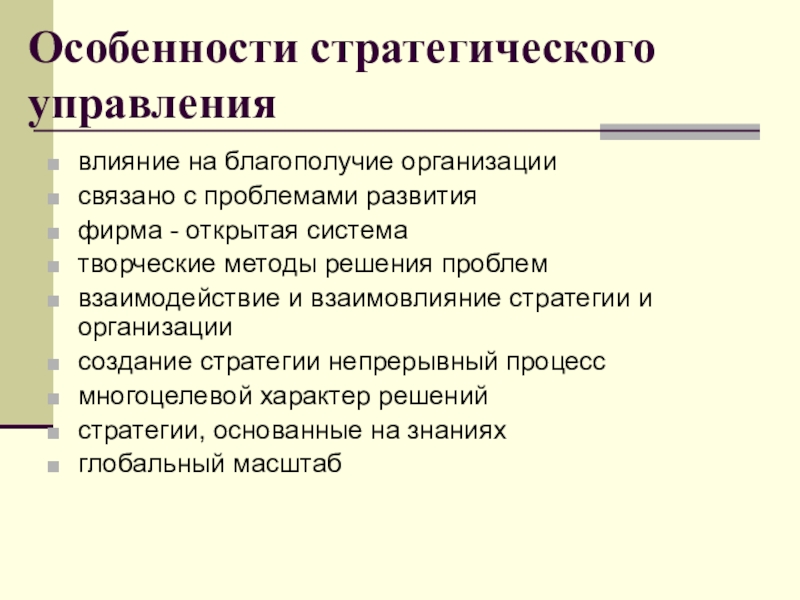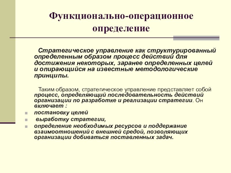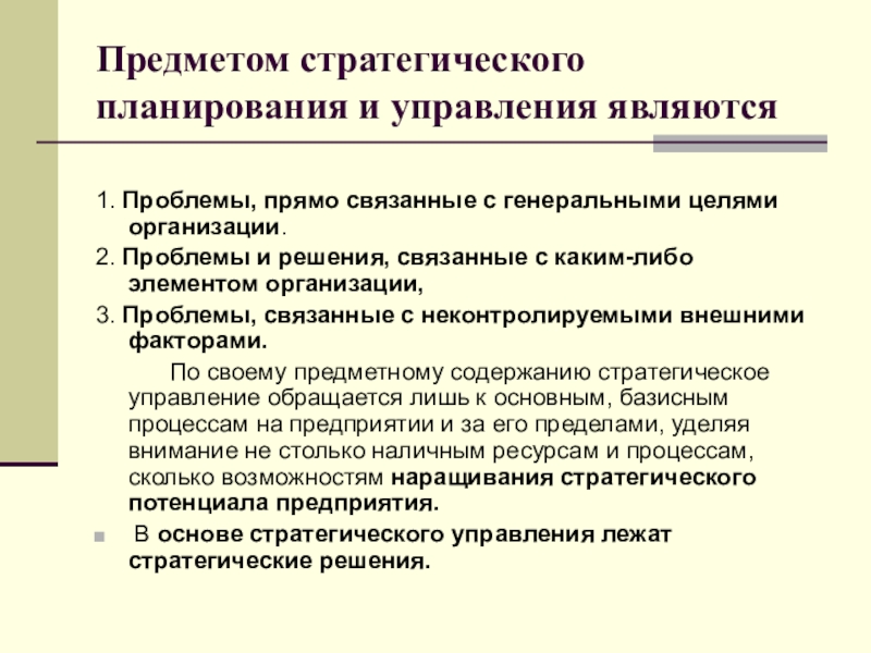 По своему предметному содержанию стратегическое управление обращается лишь к основным, базисным процессам на предприятии и за его пределами, уделяя внимание не столько наличным ресурсам и процессам, сколько возможностям наращивания стратегического потенциала предприятия.