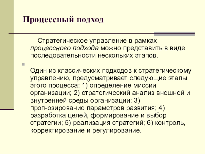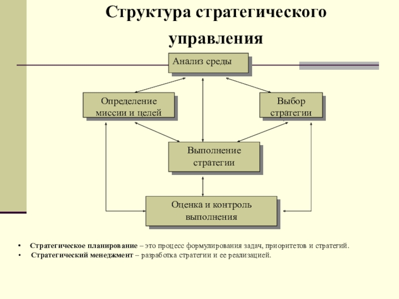 Таким образом, стратегическое управление представляет собой процесс, определяющий последовательность действий организации по разработке и реализации стратегии. Он включает :