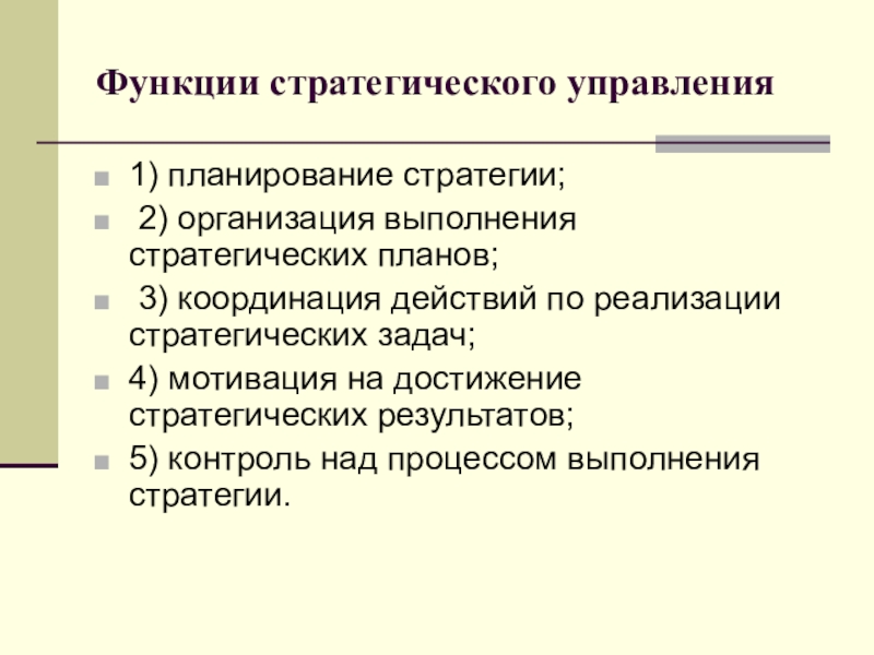 Основными содержательными итогами стратегического управления являются: 1) четкая конкурентная стратегия, консолидирующая и концентрирующая деятельность организации в едином направлении; 2) стратегический потенциал организации, который обеспечивает достижение целей в будущем; 3) изменение внутренней организационной и управленческой структуры, обеспечивающее чувствительность изменения во внешнем окружении организации к переменам во внешней среде; 4), укрепляющие рыночную позицию по отношению к конкурентам.