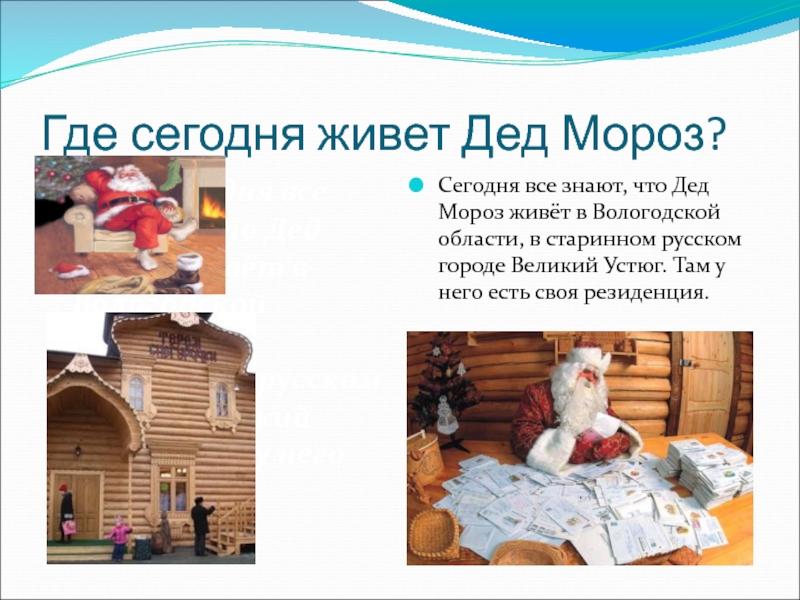 Сегодня все знают, что Дед Мороз живёт в Вологодской области, в старинном русском городе Великий Устюг. Там у него есть своя резиденция.