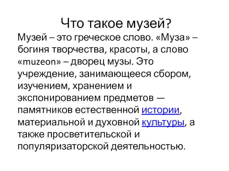 творчества, красоты, а слово «muzeon» – дворец музы. Это учреждение,