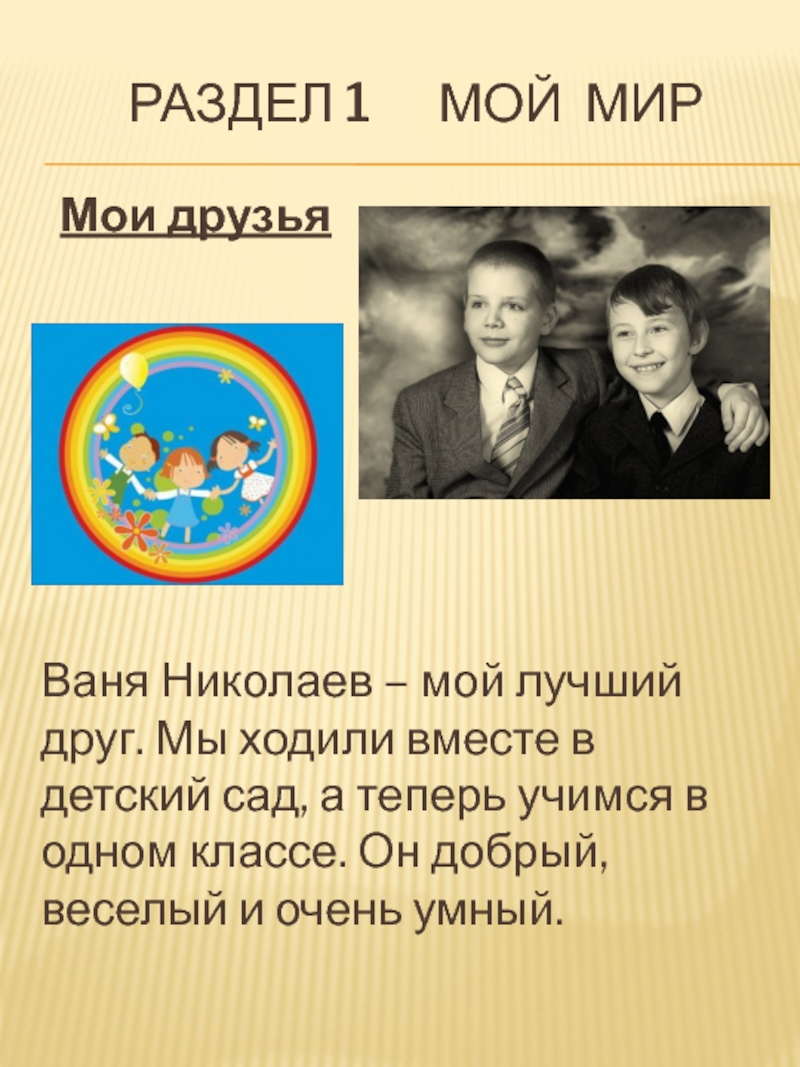 Раздел 1   Мой мир Мои друзьяВаня Николаев – мой лучший друг. Мы ходили вместе в