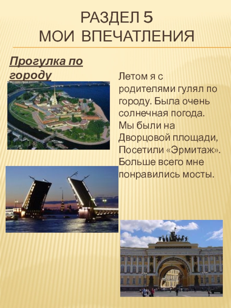 Раздел 5   Мои впечатленияПрогулка по городуЛетом я с родителями гулял по городу. Была очень солнечная