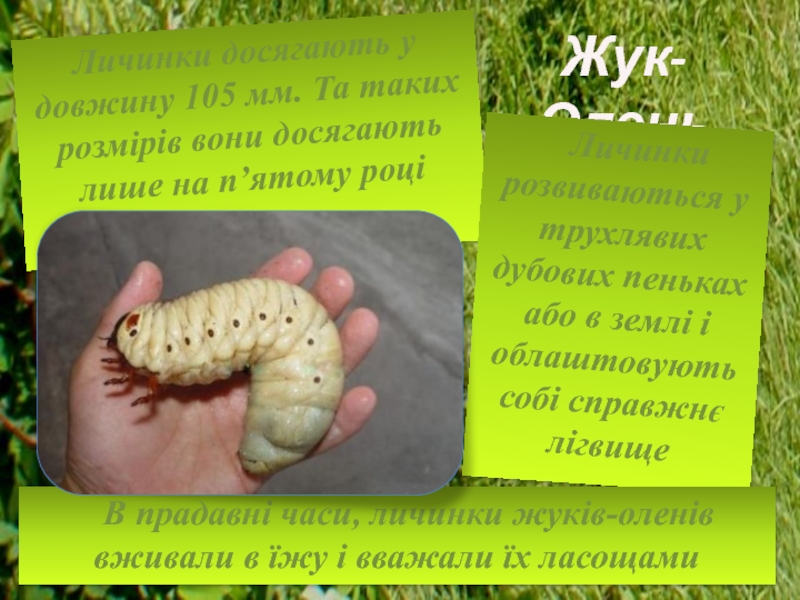 В прадавні часи, личинки жуків-оленів вживали в їжу і вважали їх ласощами