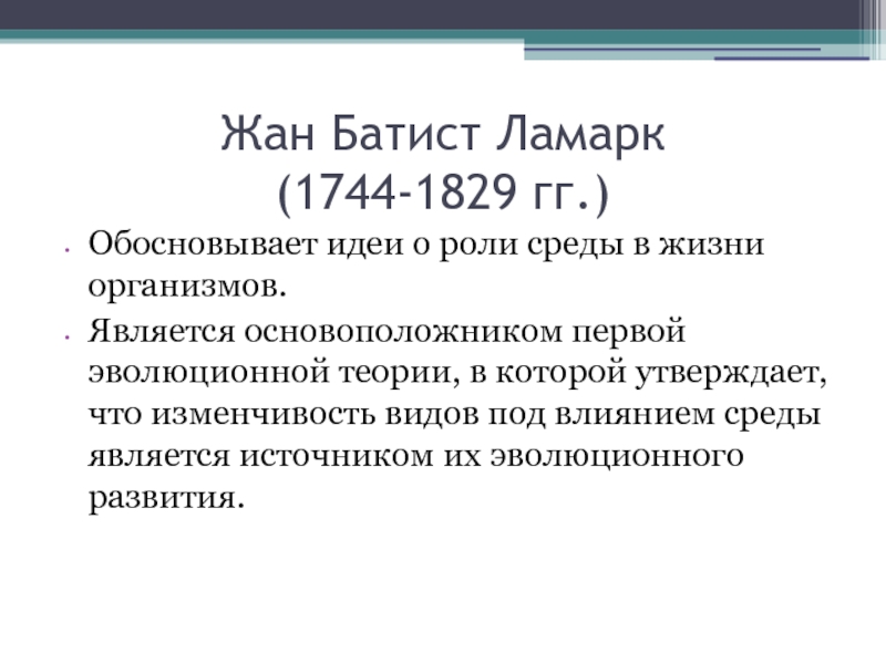 Является основоположником первой эволюционной теории, в которой утверждает, что