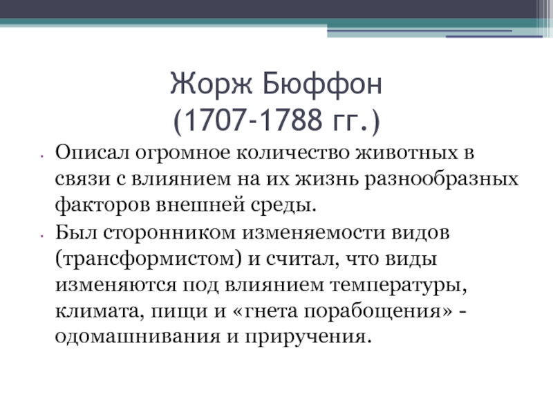 (трансформистом) и считал, что виды изменяются под влиянием температуры, климата, пищи и «гнета порабощения» - одомашнивания и приручения.