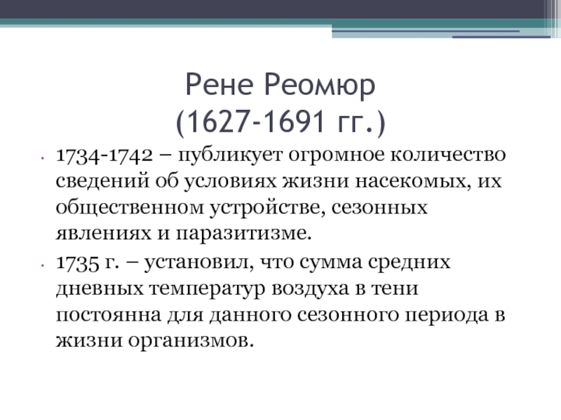 – установил, что сумма средних дневных температур воздуха в тени постоянна для данного сезонного периода в жизни организмов.
