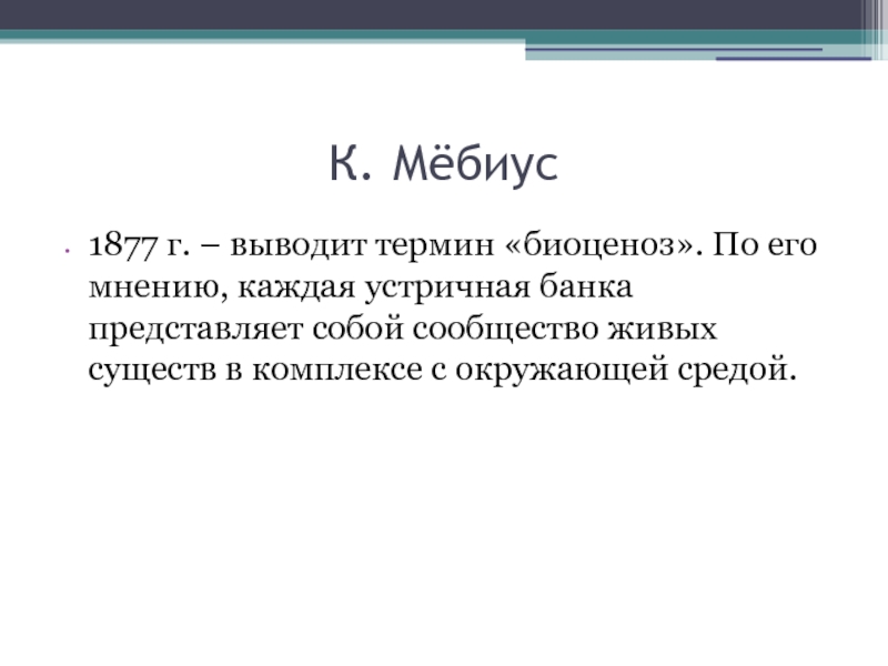 1877 г. – выводит термин «биоценоз». По его мнению,