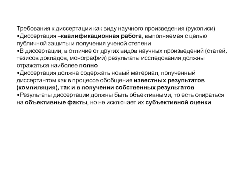•Результаты диссертации должны быть объективными, то есть опираться на объективные факты, но не исключает их субъективной оценки