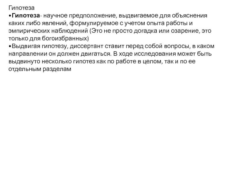 •Выдвигая гипотезу, диссертант ставит перед собой вопросы, в каком направлении он должен двигаться. В ходе исследования может быть выдвинуто несколько гипотез как по работе в целом, так и по ее отдельным разделам