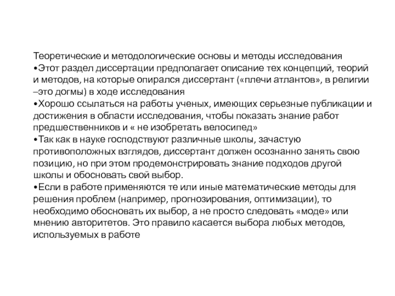 •Так как в науке господствуют различные школы, зачастую противоположных взглядов, диссертант должен осознанно занять свою позицию, но при этом продемонстрировать знание подходов другой школы и обосновать свой выбор.