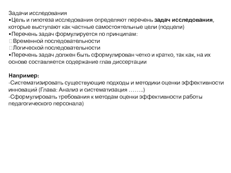 •Перечень задач должен быть сформулирован четко и кратко, так как, на их основе составляется содержание глав диссертации
