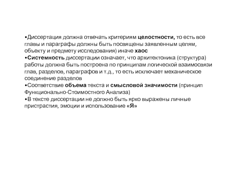 •Диссертация должна отвечать критериям целостности, то есть все главы и