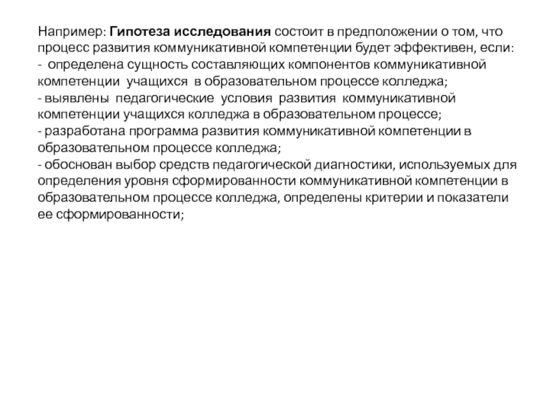 Слайд 9Например: Гипотеза исследования состоит в предположении о том, что процесс