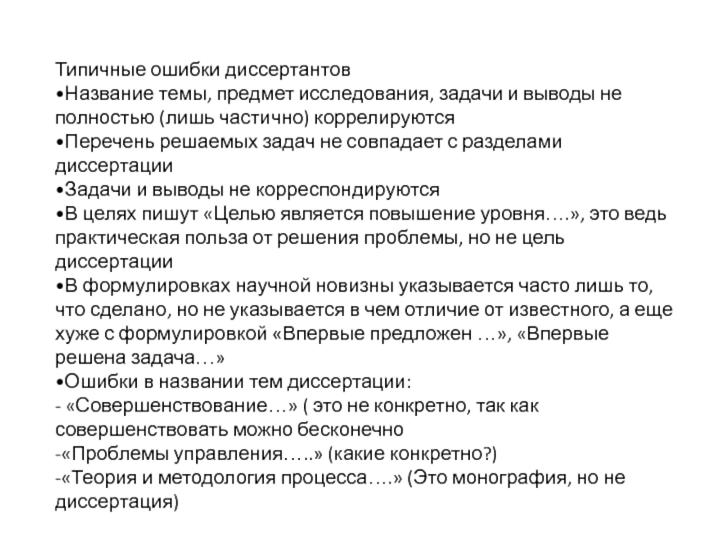 •В целях пишут «Целью является повышение уровня….», это ведь практическая польза от решения проблемы, но не цель диссертации