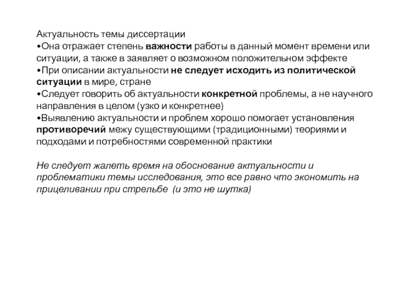Не следует жалеть время на обоснование актуальности и проблематики темы исследования, это все равно что экономить на прицеливании при стрельбе (и это не шутка)