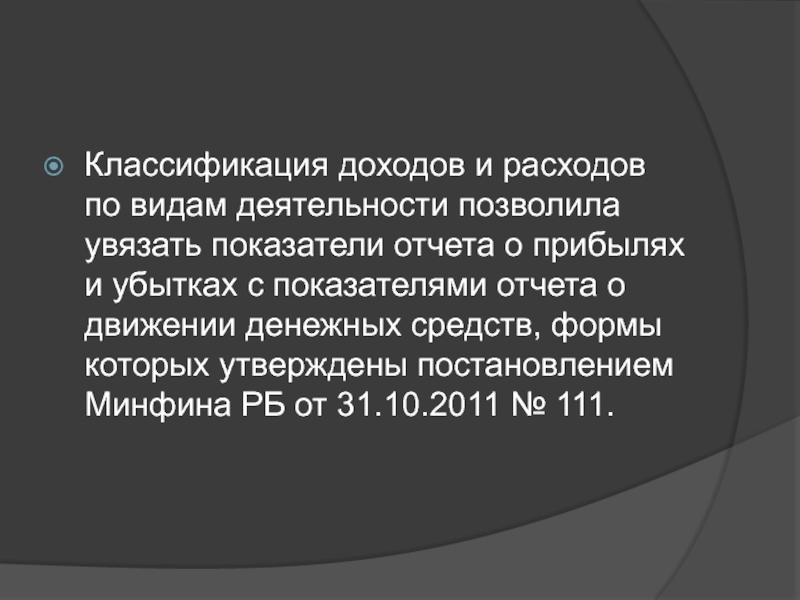 Слайд 7Классификация доходов и расходов по видам деятельности позволила увязать показатели