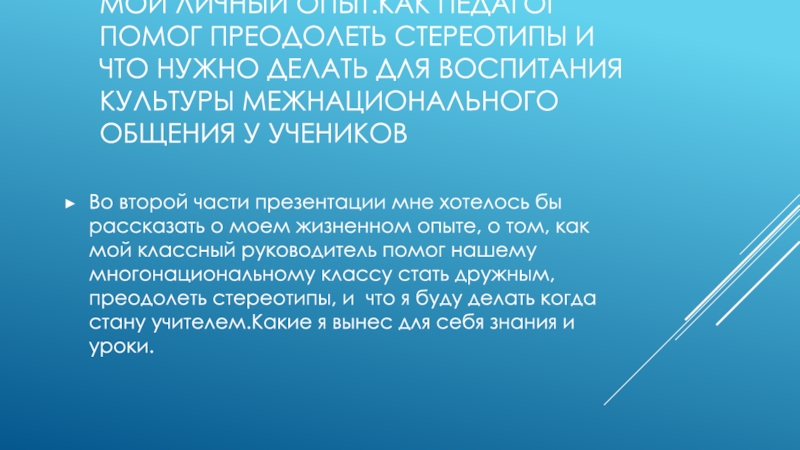 презентации мне хотелось бы рассказать о моем жизненном опыте, о том, как мой классный руководитель помог нашему многонациональному классу стать дружным,преодолеть стереотипы, и что я буду делать когда стану учителем.Какие я вынес для себя знания и уроки.
