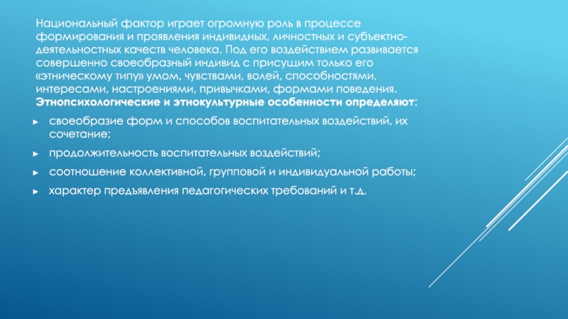 Слайд 2Национальный фактор играет огромную роль в процессе формирования и проявления