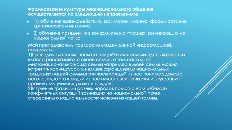 1)Проводил классные часы на тему «Я и моя семья», здесь каждый из класса рассказывал о своей семье, о том насколько многонациональна наша семья(например в моей семье можно встретить корни,русских,немцев,французев),о национальных традициях нашей семьи,в эти часы каждый из нас понимал другого,осознавал,то что каждый из нас имеет свои привычки и внутренние правила,мы учились уважать каждого.