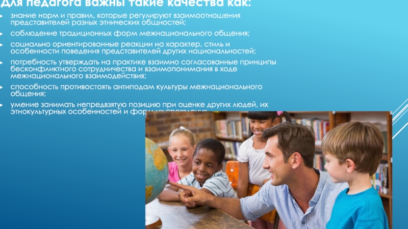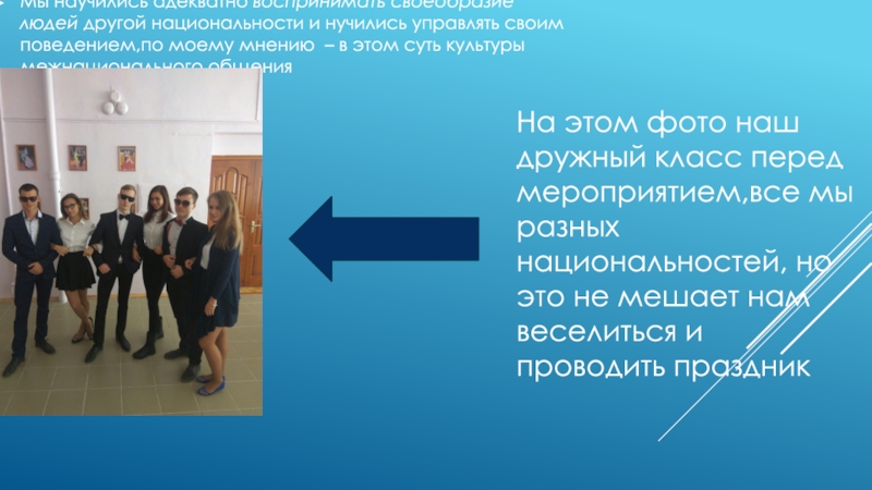 Слайд 7Мы научились адекватно воспринимать своеобразие людей другой национальности и нучились управлять своим