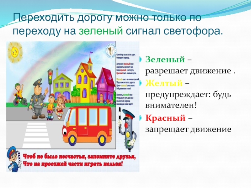 Переходить дорогу можно только по переходу на зеленый сигнал светофора.Зеленый – разрешает движение .Желтый – предупреждает: будь