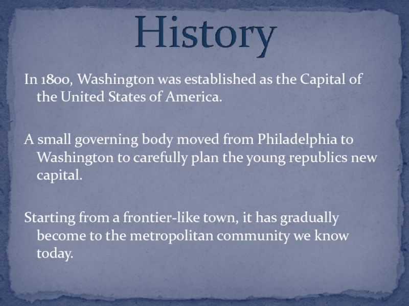 to Washington to carefully plan the young republics new capital.Starting from a frontier-like town, it has gradually become to the metropolitan community we know today.