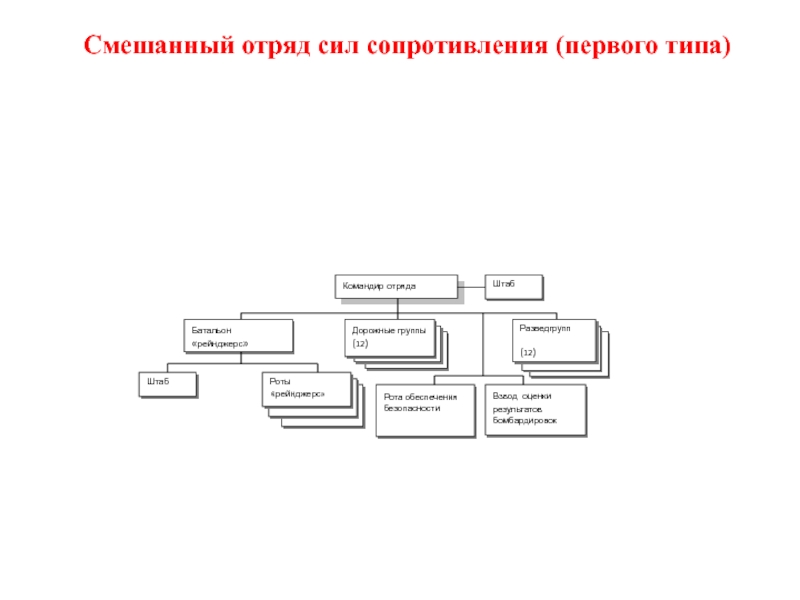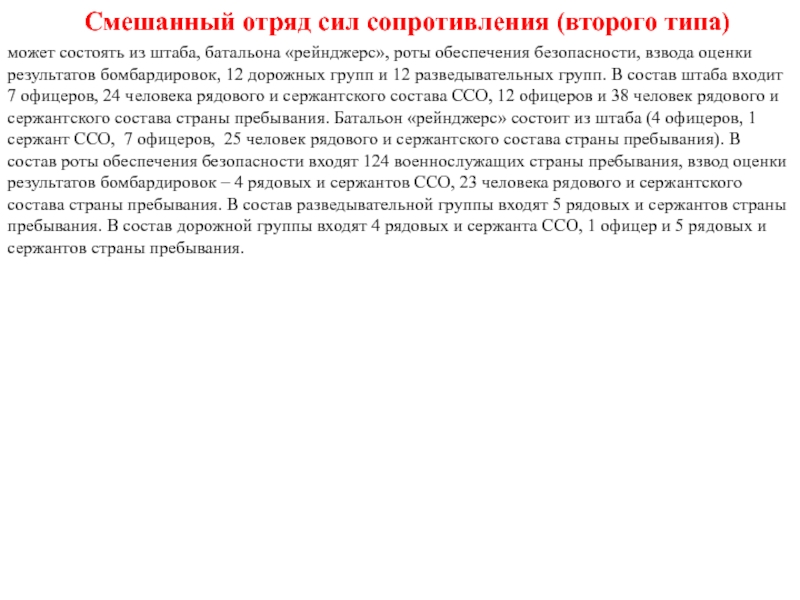 Смешанный отряд сил сопротивления (первого типа) может состоять, по взглядам НАТО, из штаба группы постоянной готовности и разведывательного взвода. В штабе – 46 иностранных военнослужащих ССО (21 офицер, 25 человек рядового и сержантского состава). Группа постоянной готовности состоит из штаба (5 офицеров и 3 человека рядового состава ССО, 10 офицеров и 150 человек рядового и сержантского состава военнослужащих страны пребывания). Разведывательный взвод состоит из штаба (5 офицеров и 3 человек рядового и сержантского состава ССО), 6-8 дорожных групп (в каждой 2 офицера и 4 человека рядового и сержантского состава страны пребывания), 14-16 разведывательных групп (в каждой 1 офицер и 2 человека рядового и сержантского состава ССО, 2 офицера и 4 человека рядового и сержантского состава страны пребывания).