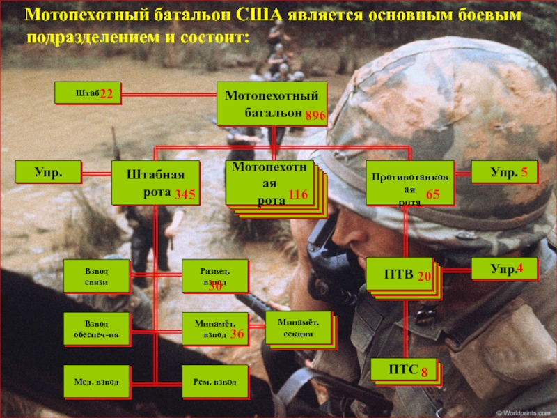 Батальон «рейнджерс» состоит из штаба (4 офицеров, 1 сержант ССО, 7 офицеров, 25 человек рядового и сержантского состава страны пребывания).