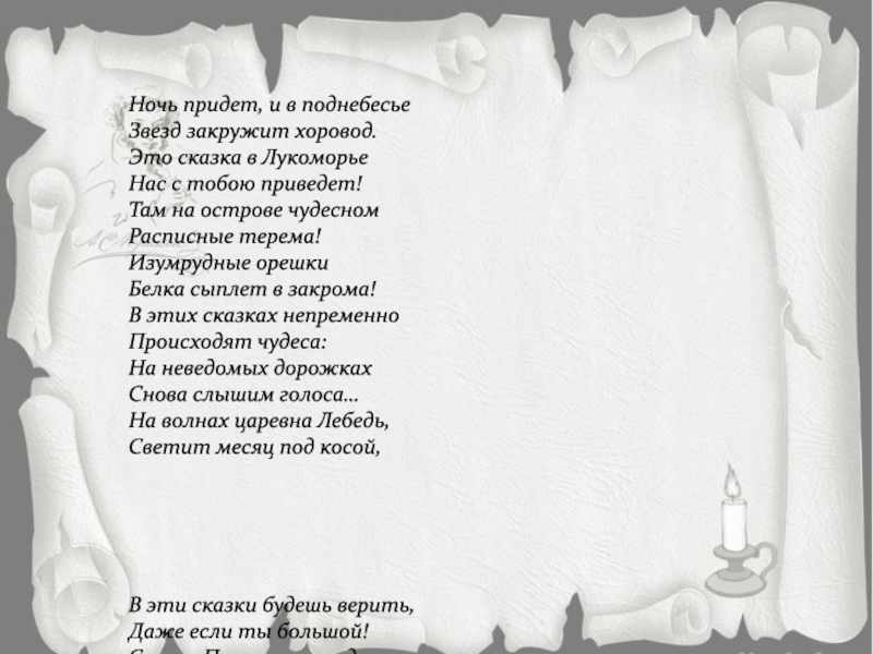 Няня рассказывала ему сказки, пела народные песни, и Пушкин был восхищен их поэтичностью. В то время в деревне рассказывалось множество интереснейших сказок, повторялось громадное количество поэтических загадок, пословиц и поговорок. Все это сочинялось народами, крестьянскими поэтами, которые грамоты не знали, своих рассказов, стихов и песен не записывали, а рассказывали и пели их, передавая друг другу с голоса. Пушкин приглашал к себе простолюдинов, знающих много песен и сказок, и записывал то, что слышал от них.