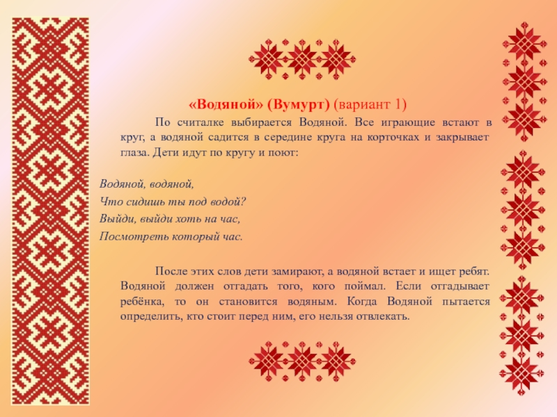 После этих слов дети замирают, а водяной встает и ищет ребят. Водяной должен отгадать того, кого поймал. Если отгадывает ребёнка, то он становится водяным. Когда Водяной пытается определить, кто стоит перед ним, его нельзя отвлекать.