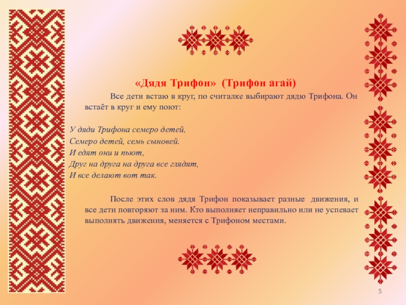 После этих слов дядя Трифон показывает разные движения, и все дети повторяют за ним. Кто выполняет неправильно или не успевает выполнять движения, меняется с Трифоном местами.