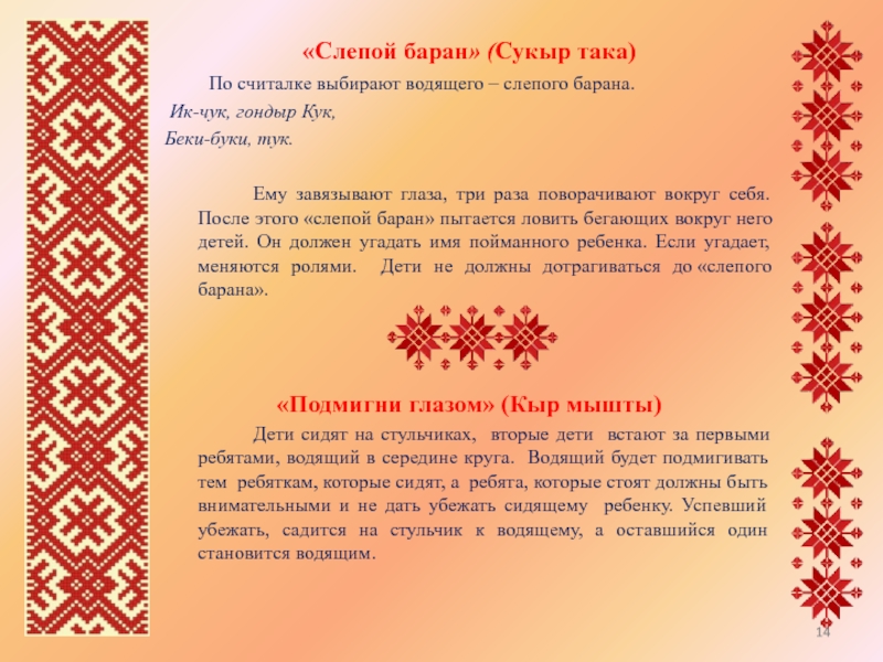 себя. После этого «слепой баран» пытается ловить бегающих вокруг него детей. Он должен угадать имя пойманного ребенка. Если угадает, меняются ролями. Дети не должны дотрагиваться до «слепого барана».