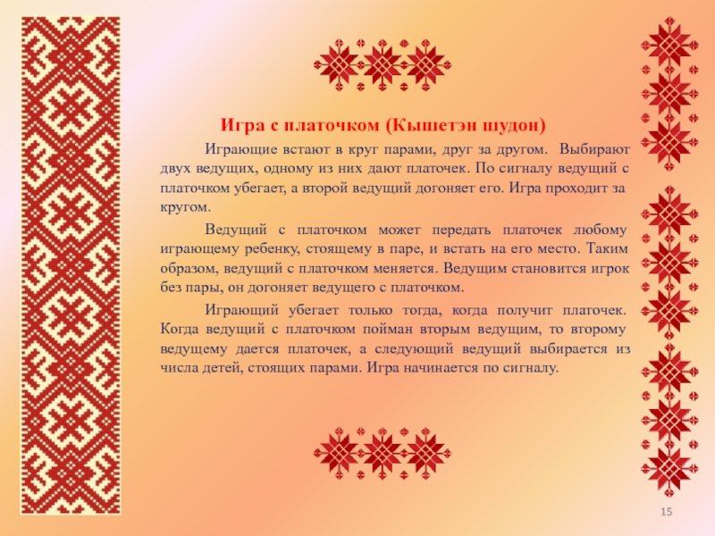 Играющий убегает только тогда, когда получит платочек. Когда ведущий с платочком пойман вторым ведущим, то второму ведущему дается платочек, а следующий ведущий выбирается из числа детей, стоящих парами. Игра начинается по сигналу.
