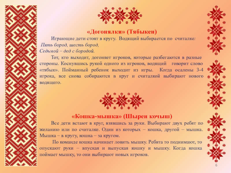 Тот, кто выходит, догоняет игроков, которые разбегаются в разные стороны. Коснувшись рукой одного из игроков, водящий говорит слово «тябык». Пойманный ребенок выходит из игры. Когда осалены 3-4 игрока, все снова собираются в круг и считалкой выбирают нового водящего.