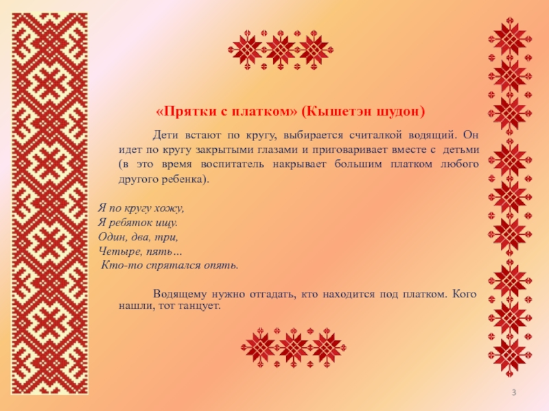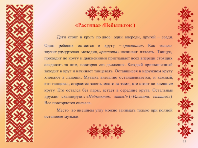 сзади. Один ребенок остается в кругу – «растяпа». Как только звучит удмуртская