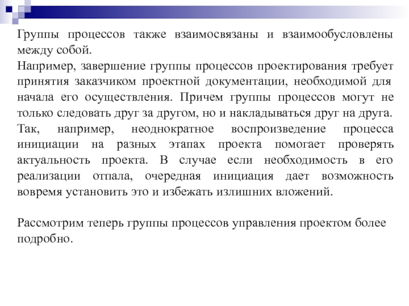 начала его осуществления. Причем группы процессов могут не только следовать друг за другом, но и накладываться друг на друга. Так, например, неоднократное воспроизведение процесса инициации на разных этапах проекта помогает проверять актуальность проекта. В случае если необходимость в его реализации отпала, очередная инициация дает возможность вовремя установить это и избежать излишних вложений.