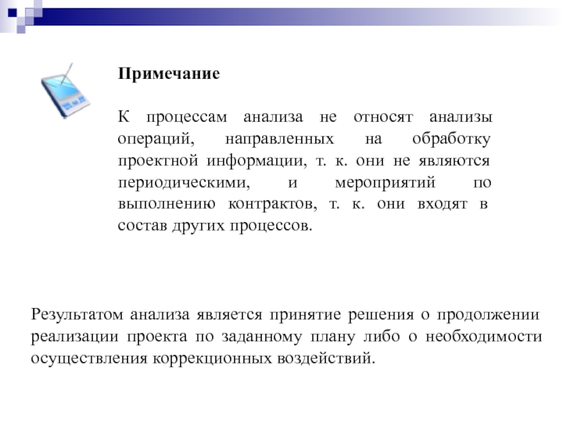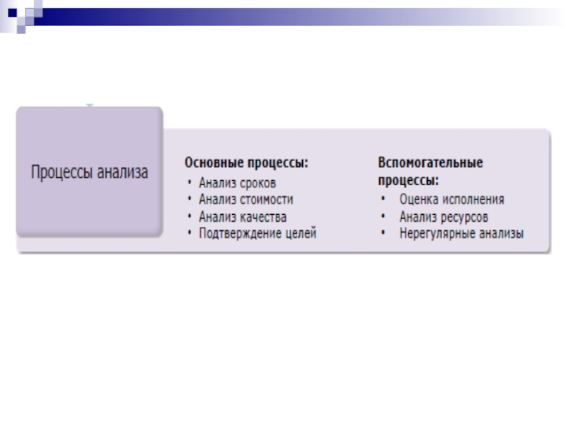 Слайд 21Процессы анализа. Эти процессы включают в себя как рассмотрение плана