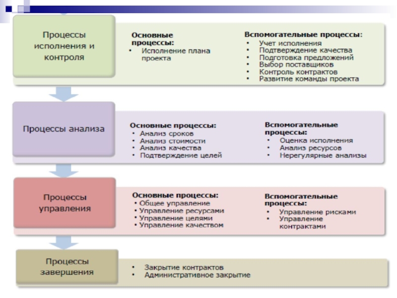 4. процессы анализа – процессы установления соответствия проектного плана и фактического исполнения проекта, а также принятия решений о необходимости оказания коррекционных воздействий;