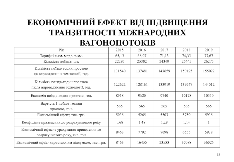 Слайд 13ЕКОНОМІЧНИЙ ЕФЕКТ ВІД ПІДВИЩЕННЯ ТРАНЗИТНОСТІ МІЖНАРОДНИХ ВАГОНОПОТОКІВ