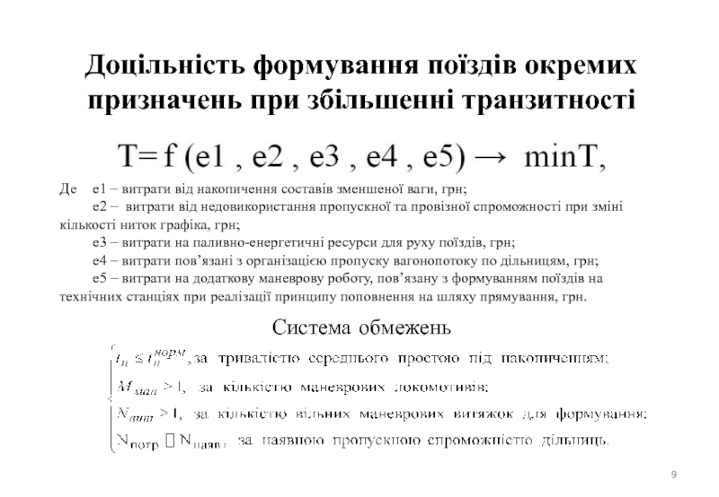 Слайд 9Доцільність формування поїздів окремих призначень при збільшенні транзитності