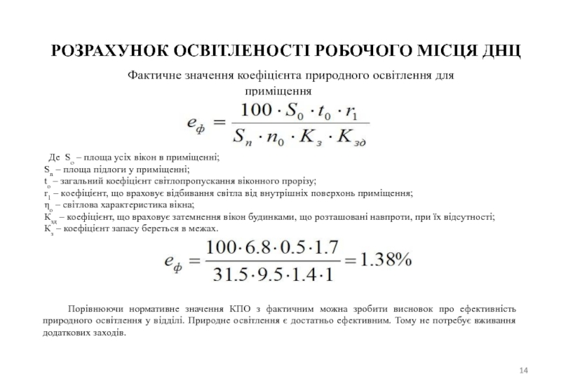 Слайд 14РОЗРАХУНОК ОСВІТЛЕНОСТІ РОБОЧОГО МІСЦЯ ДНЦ