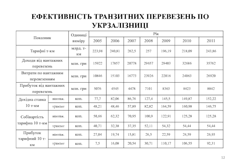 Слайд 12ЕФЕКТИВНІСТЬ ТРАНЗИТНИХ ПЕРЕВЕЗЕНЬ ПО УКРЗАЛІЗНИЦІ