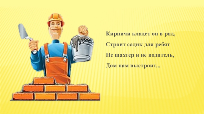 Кирпичи кладет он в ряд,Строит садик для ребятНе шахтер и не водитель,Дом нам выстроит...