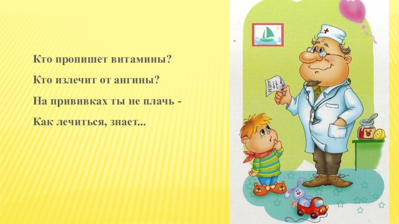 Кто пропишет витамины?Кто излечит от ангины?На прививках ты не плачь -Как лечиться, знает...